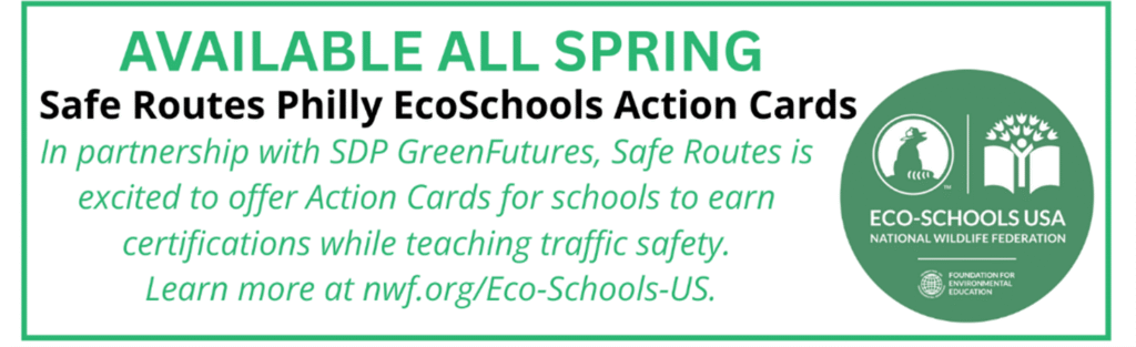 Check out the new Safe Routes Philly EcoSchool Action Cards. EcoSchools support the School District’s GreenFutures program. Click here to learn more and create an account as a school staff member, student, or volunteer.