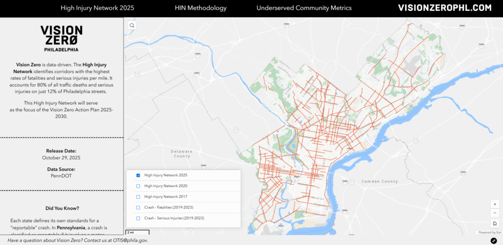 To support the Action Plan, the High Injury Network, the 12% of streets with 80% of fatalities and serious injuries, was updated with crash data from 2019-2023. Click the thumbnail to explore the High Injury Network and the crashes that informed it. Click the image below to download a copy of the map. To download the GIS layer, visit Open Data PHL.
